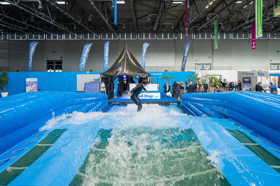 Die Welle schwimmt auf 35-40 Kubikmeter Wasser, die immer wieder hochgepumpt werden und so eine endlose Welle formen. So passen die Surf-Days in die Bemühungen, den Natursport Wellenreiten